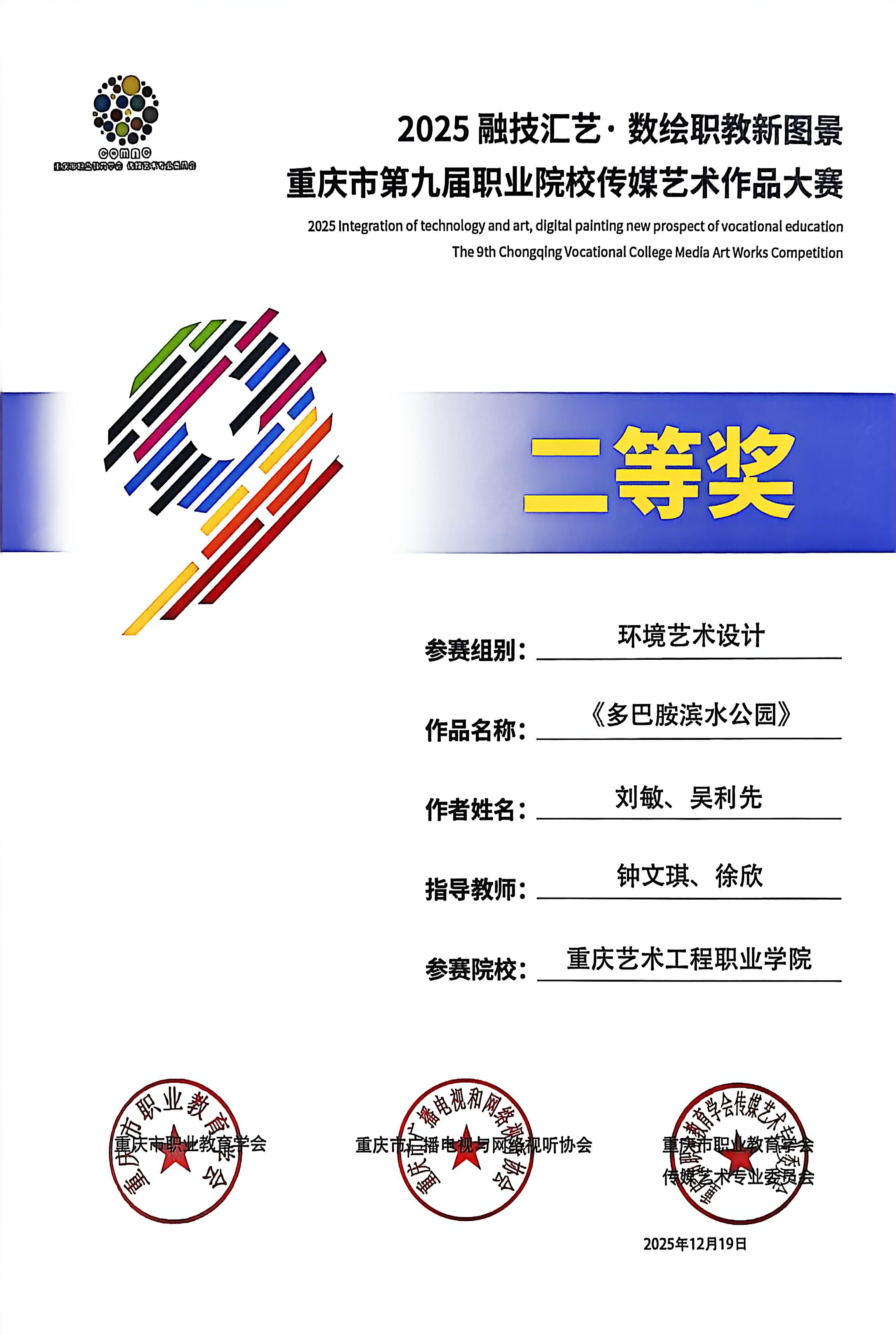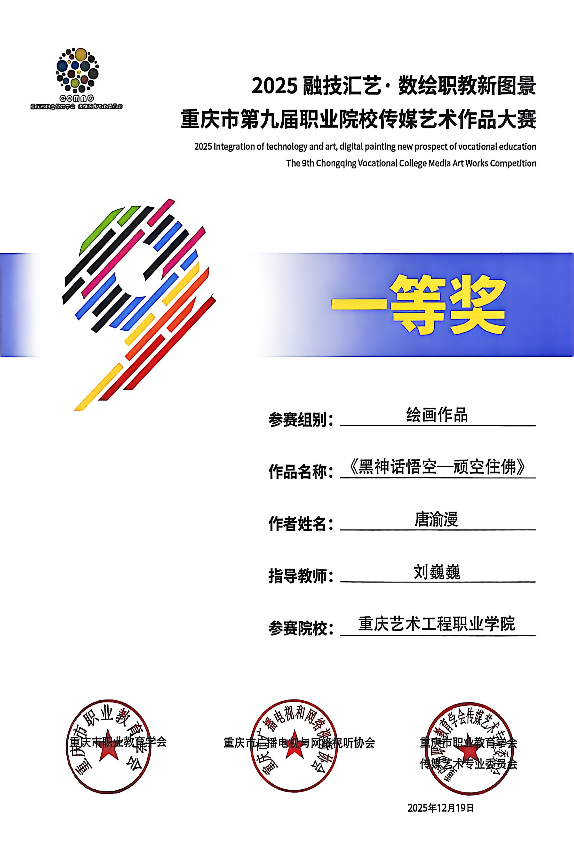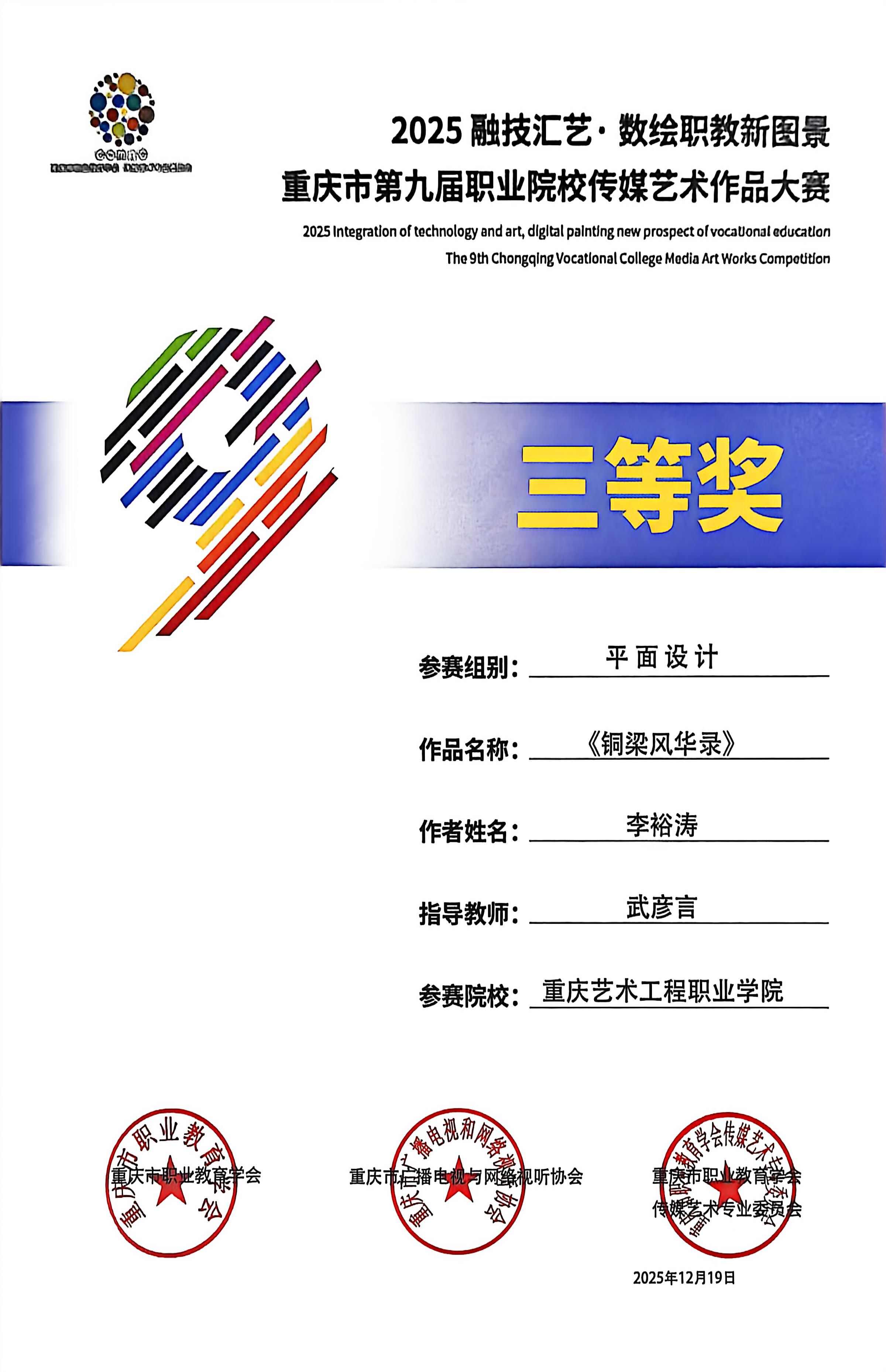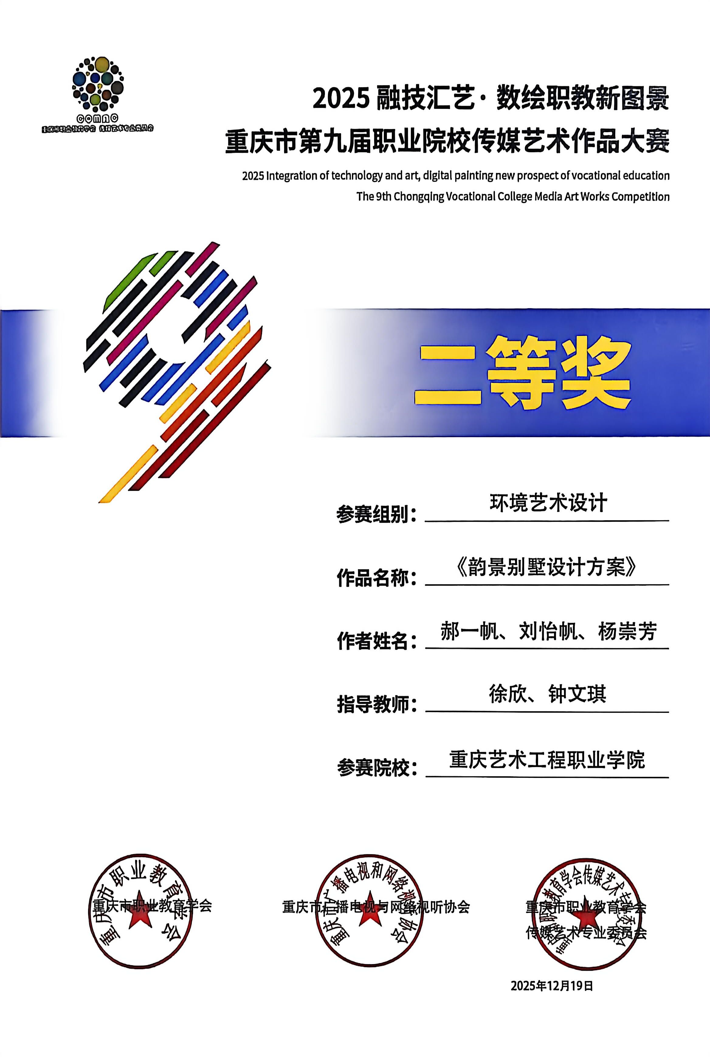 喜报:恭喜艺术设计学院师生在 2025“融技汇艺・数绘职教新图景” 重庆市第九届职业院校传媒艺术作品大赛中斩获多项荣誉,其中获一等奖1项、二等奖6项、三等奖3项、优秀指导教师2项。重庆市第九届职业院校传媒艺术作品大赛是市级职业院校传媒艺术领域核心赛事,由市级职教、传媒行业协会联合主办,专业性强、覆盖领域广,是区域职教艺术实践成果的重要展示平台。此次获奖充分展现了我院师生在艺术创作与设计实践中的扎实能力!