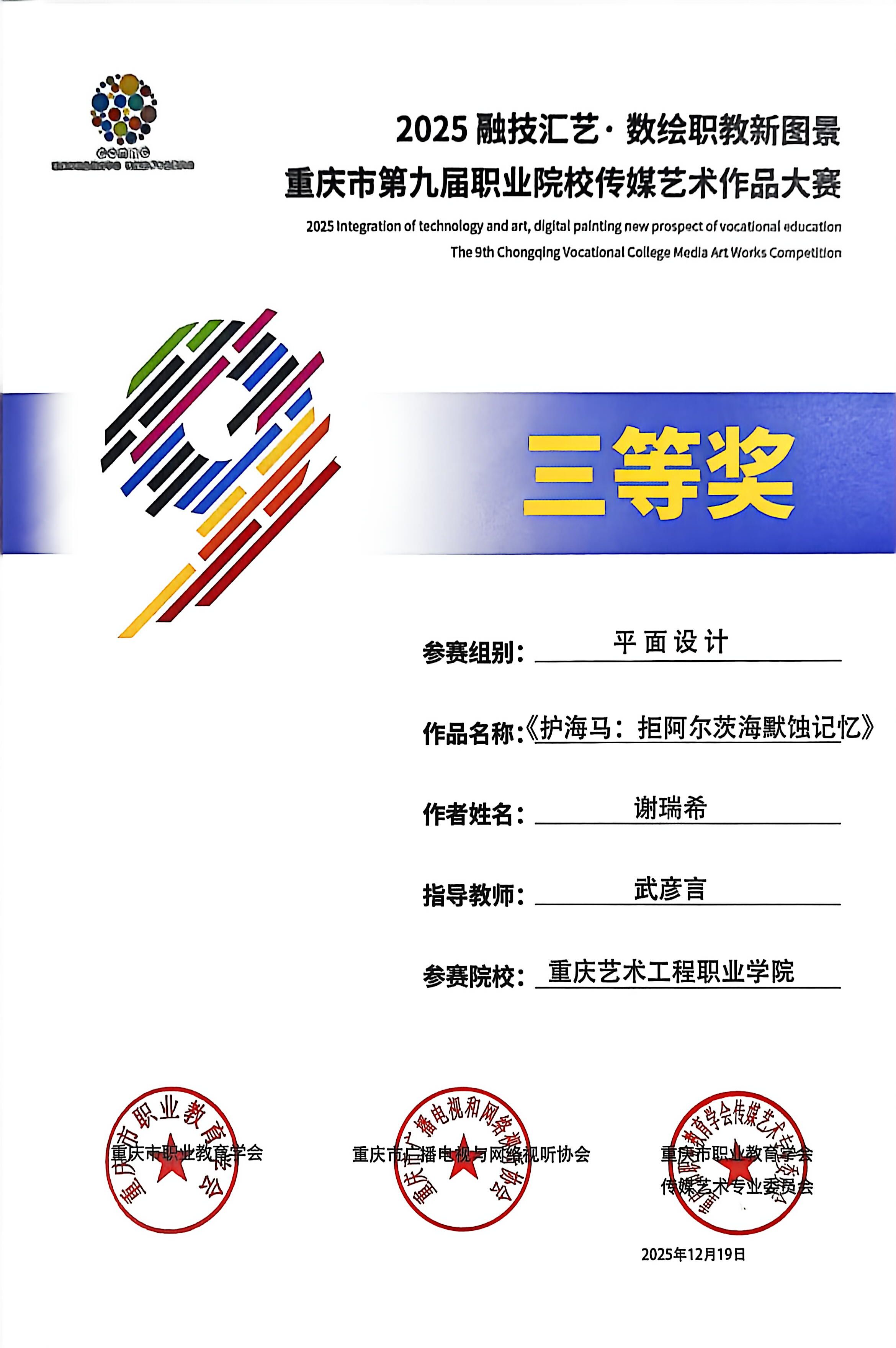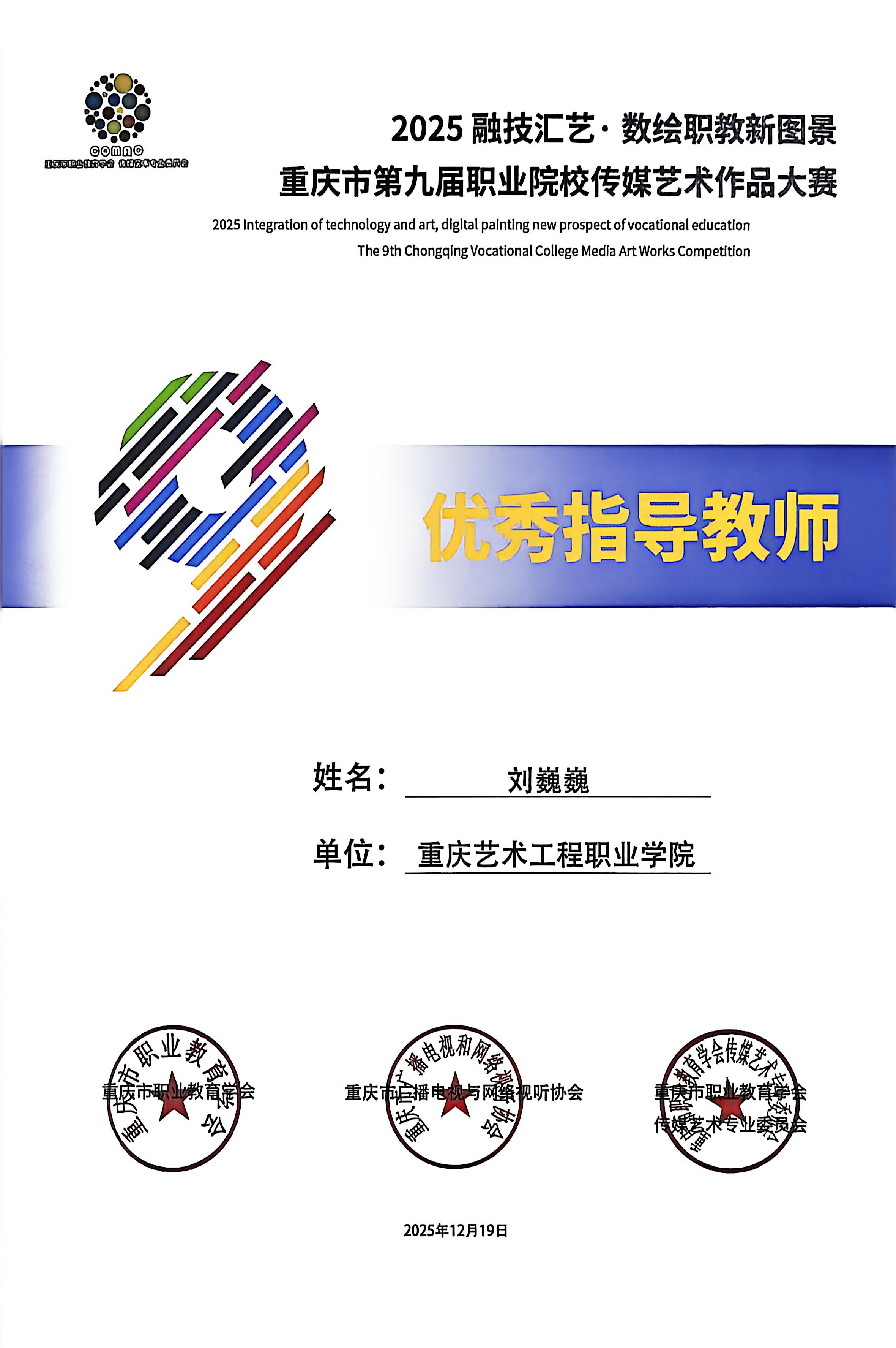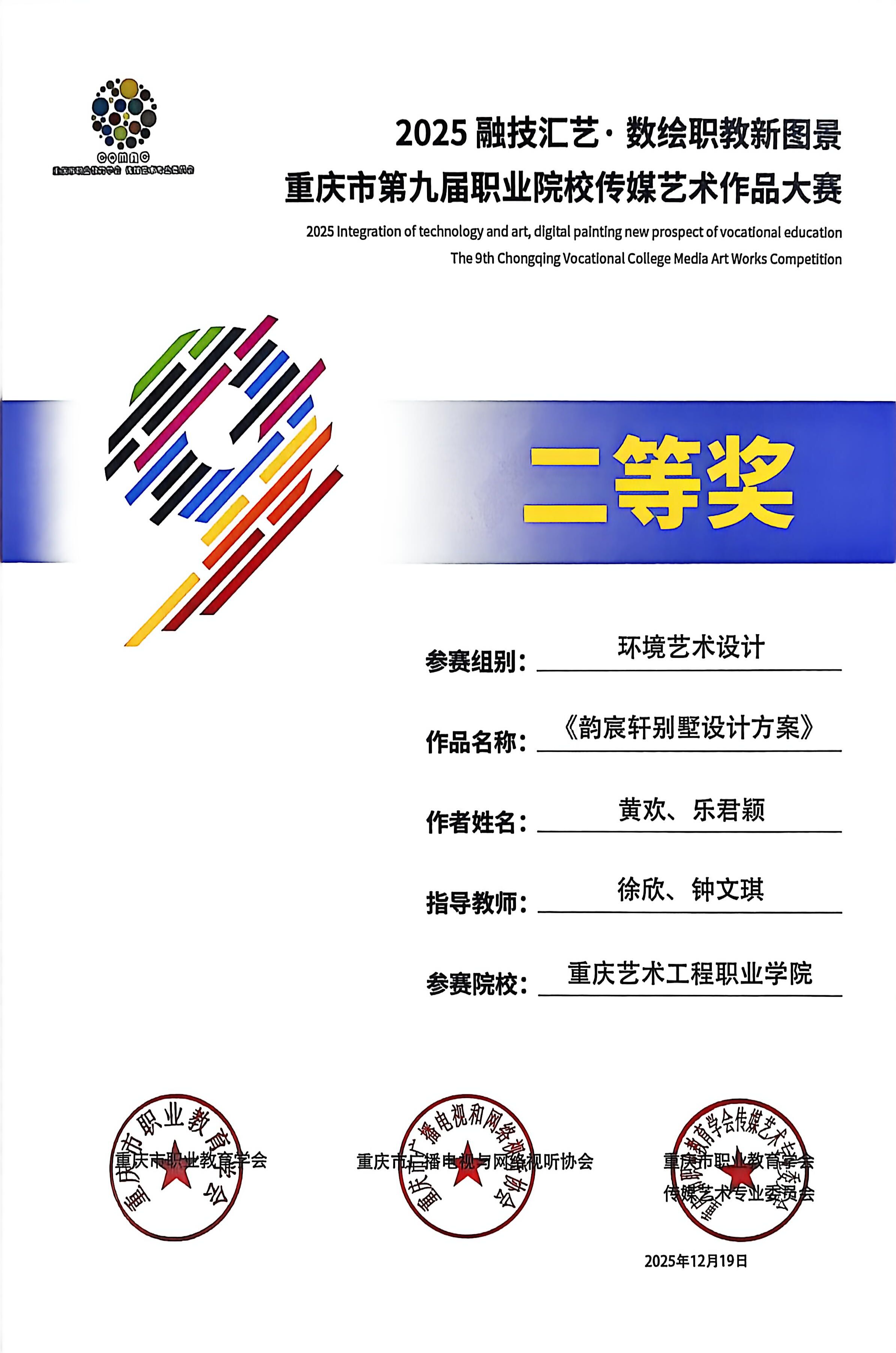 喜报:恭喜艺术设计学院师生在 2025“融技汇艺・数绘职教新图景” 重庆市第九届职业院校传媒艺术作品大赛中斩获多项荣誉,其中获一等奖1项、二等奖6项、三等奖3项、优秀指导教师2项。重庆市第九届职业院校传媒艺术作品大赛是市级职业院校传媒艺术领域核心赛事,由市级职教、传媒行业协会联合主办,专业性强、覆盖领域广,是区域职教艺术实践成果的重要展示平台。此次获奖充分展现了我院师生在艺术创作与设计实践中的扎实能力!