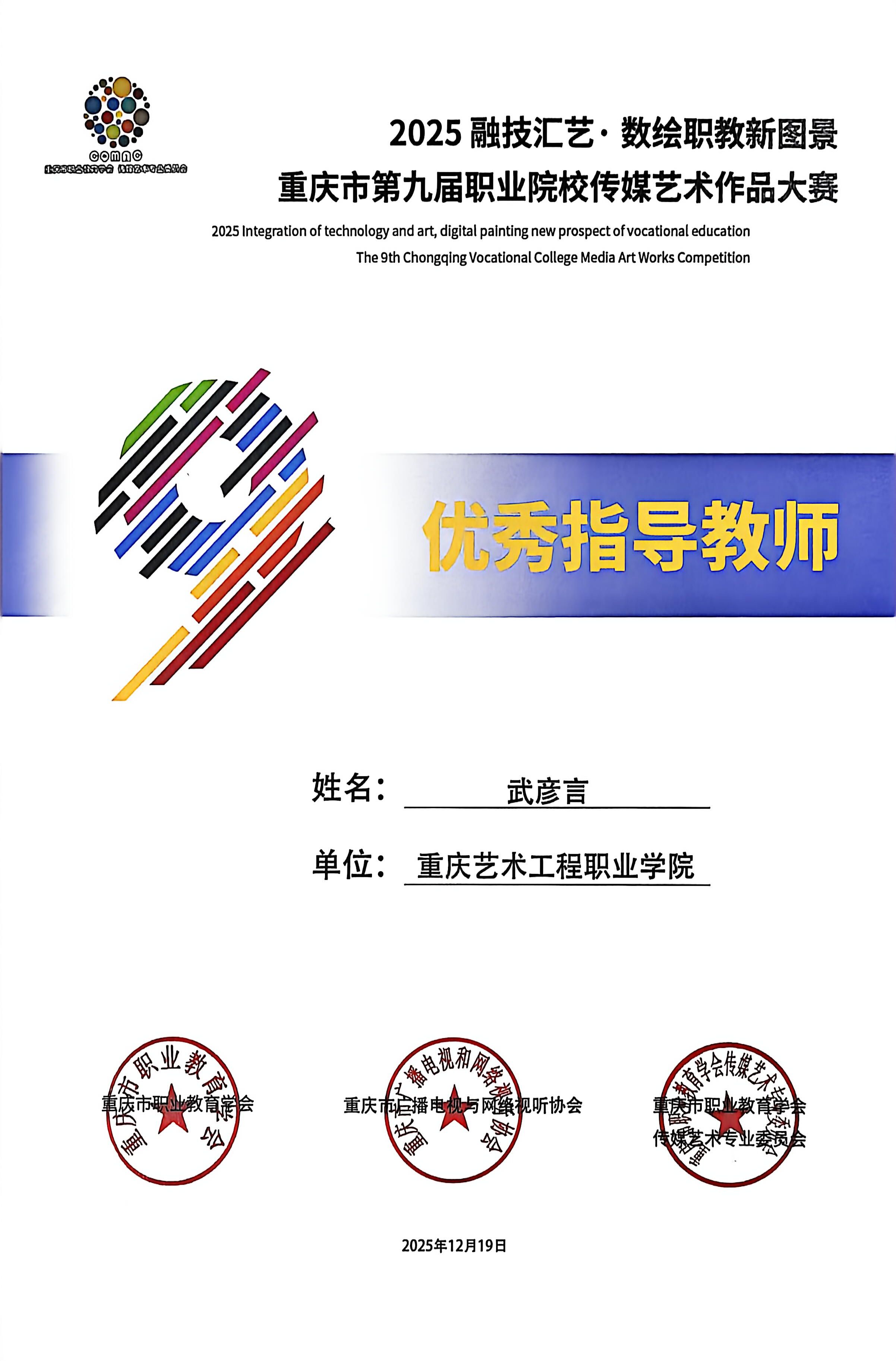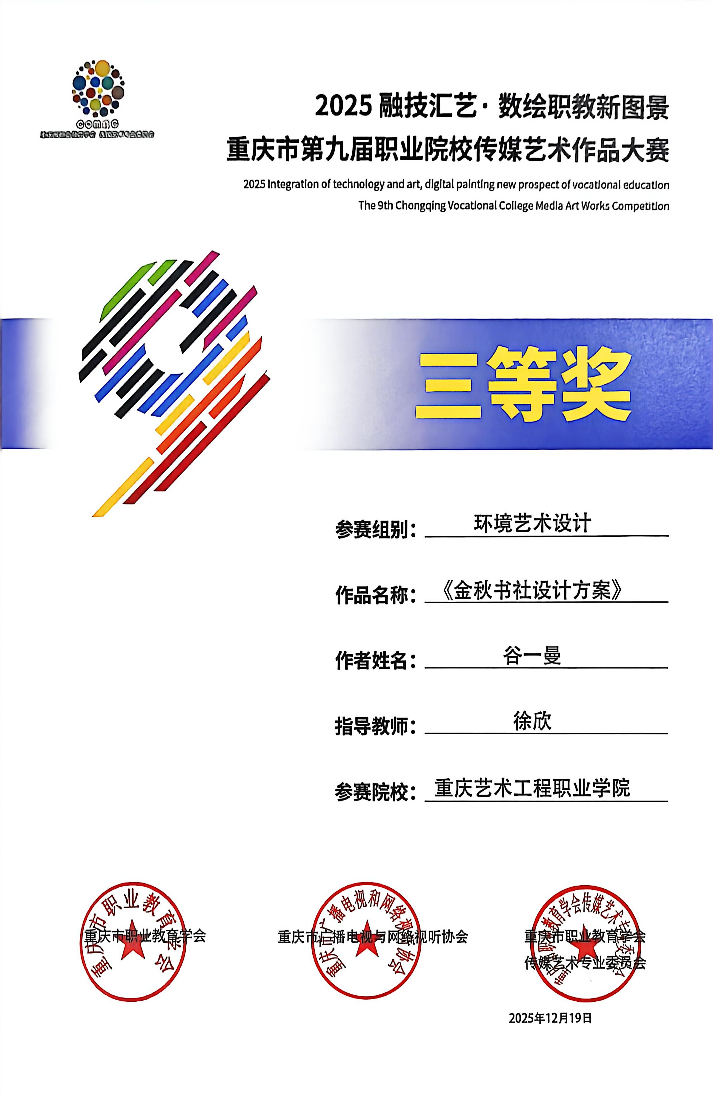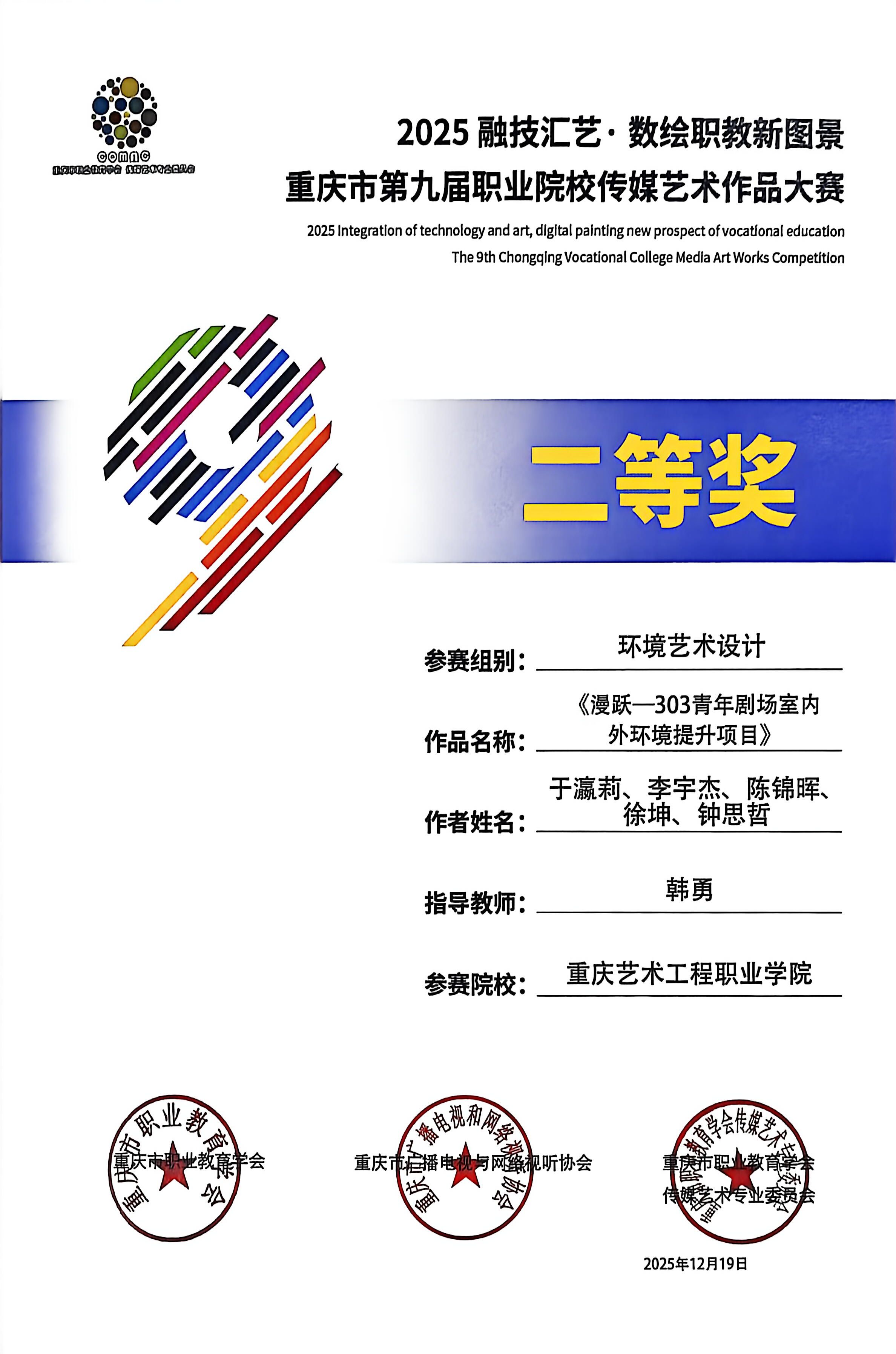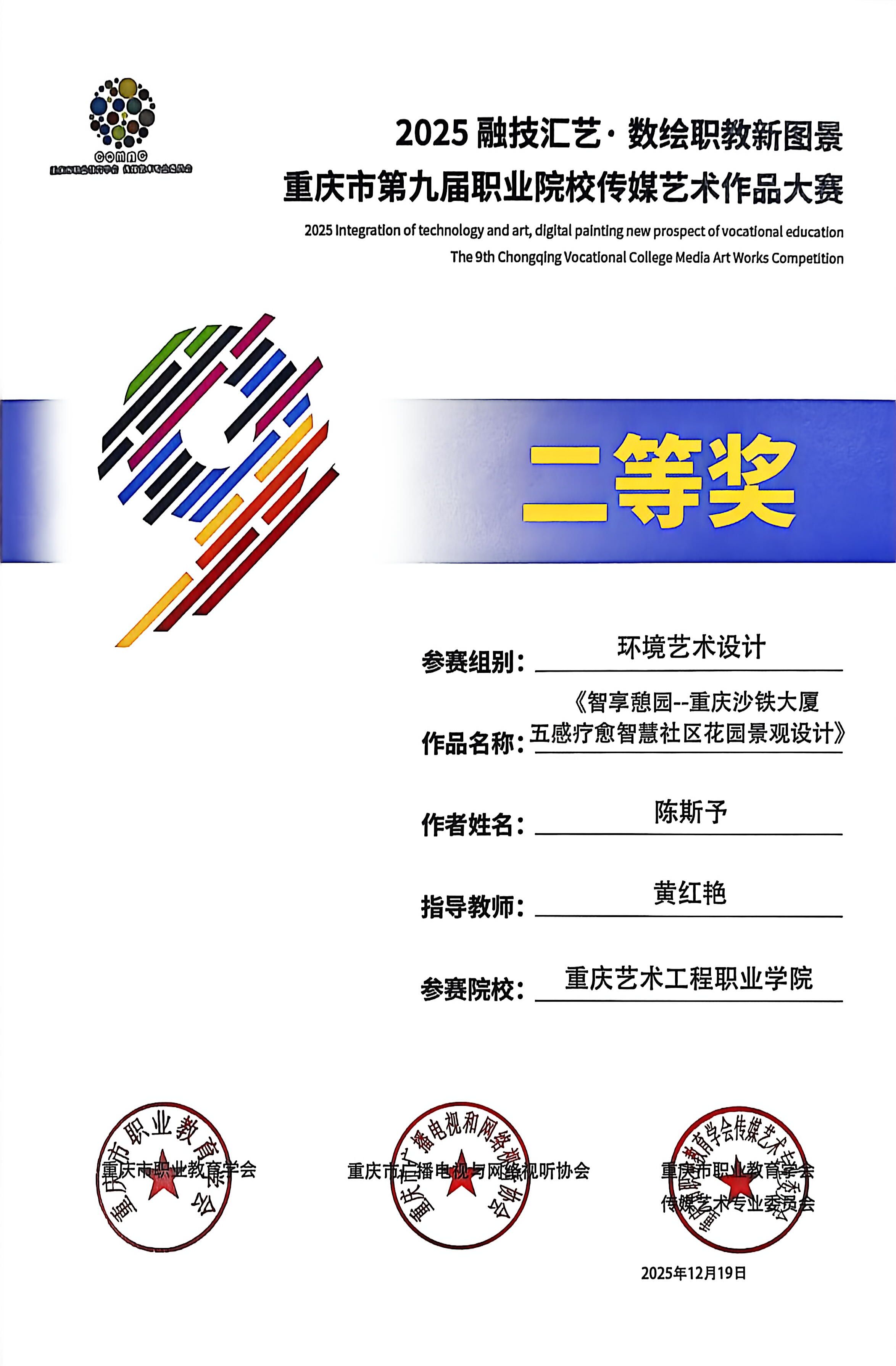 喜报:恭喜艺术设计学院师生在 2025“融技汇艺・数绘职教新图景” 重庆市第九届职业院校传媒艺术作品大赛中斩获多项荣誉,其中获一等奖1项、二等奖6项、三等奖3项、优秀指导教师2项。重庆市第九届职业院校传媒艺术作品大赛是市级职业院校传媒艺术领域核心赛事,由市级职教、传媒行业协会联合主办,专业性强、覆盖领域广,是区域职教艺术实践成果的重要展示平台。此次获奖充分展现了我院师生在艺术创作与设计实践中的扎实能力!